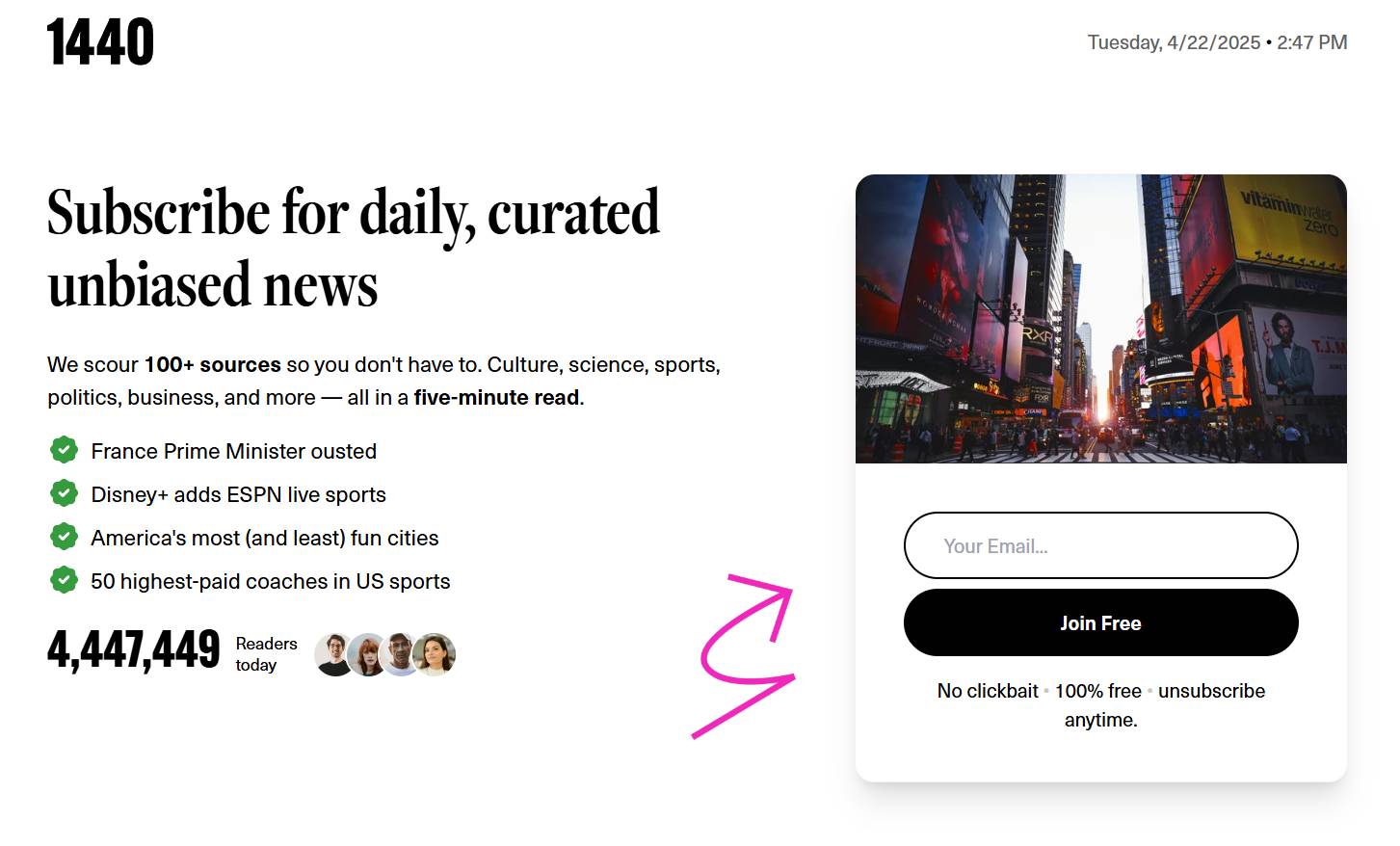 - Número de suscriptores. La llamada prueba social (social proof) del impacto del boletín. 1440 usa una cifra elocuente para reflejar popularidad (otras newsletters usan testimonios para reflejar incidencia).