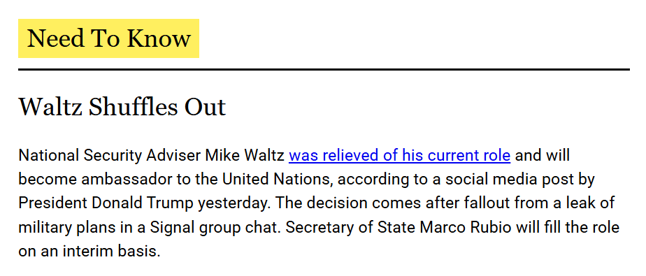 Su primera sección es “Need to Know” (necesitas saber). Habitualmente son tres noticias explicadas en tres párrafos. Cada párrafo suele llevar uno o dos enlaces a fuentes externas. Este es un boletín que hace curatoría intensiva del día a día informativo y para eso revisan más de 100 fuentes de noticias. De nuevo, no hay fotos ni imágenes en esta sección.