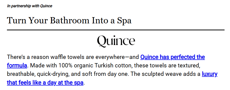 Después viene el mensaje patrocinado que también se presenta en tres párrafos, con una curiosidad que podríamos desglosar en un futuro envío de La fábrica de boletines: la URL promocionada se inserta hasta dos veces en cada párrafo. Abajo de este mensaje, al centro, aparece un llamado a la audiencia de 1440: “Please support our sponsors!” En esta sección aparece el logo del patrocinador, pero suele mimetizarse con el texto y no ser tan relevante.