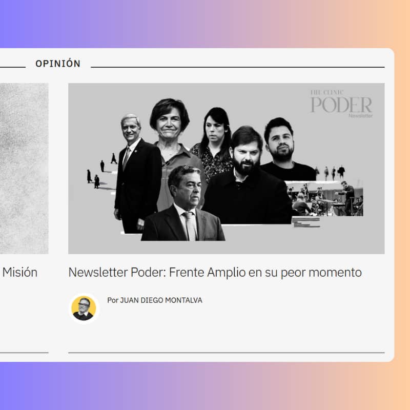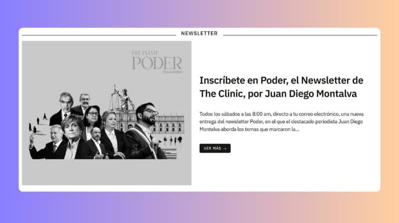 Además, crearon otra caja con encabezado (newsletter), imagen (un collage del poder en Chile) y la frase “Inscríbete en Poder, el Newsletter de The Clinic, por Juan Diego Montalva”, seguida de una breve descripción tipo landing que, curiosamente, no se alcanza a leer completa (puntos suspensivos).